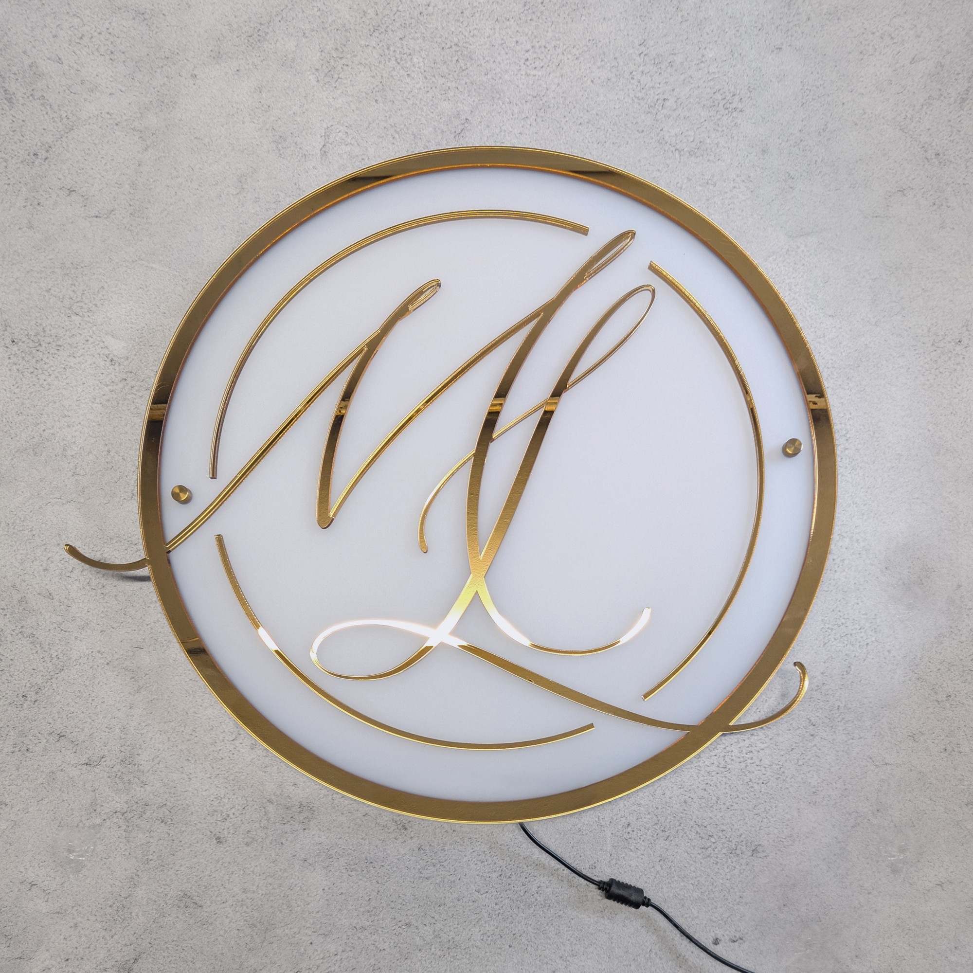Logo podświetlane wykonane według projektu klientki. Zastosowano pleksi pastelowo-różową oraz złotą lustrzaną.